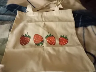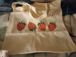 Bolso de tela con un divertido estampado de fresas rojas sobre fondo beige. Ideal para llevar tus compras o pertenencias con un toque alegre. - Diseño con cuatro fresas. - Asas cómodas para llevar al hombro.
