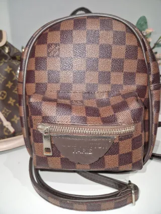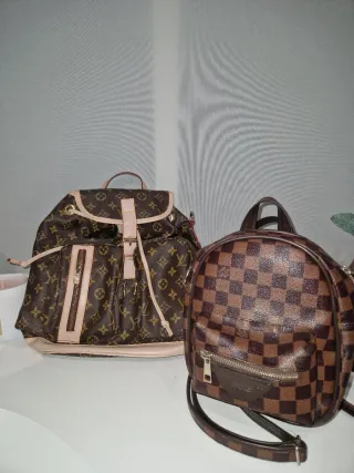 Conjunto de dos mochilas con el distintivo estampado. - Un bolso tipo mochila con cierre de cordón y solapa. - Un bolso tipo mini mochila con estampado de cuadros.