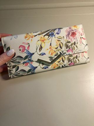 Elegante cartera con un bonito estampado floral sobre fondo blanco. Perfecta para llevar tus esenciales con estilo. - Diseño con flores multicolores. - Cierre de solapa con detalle metálico.