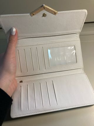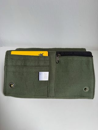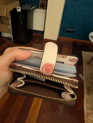 Monedero práctico con diseño flores. Lleva un lugar para insertar fotos o tarjeta visible y luego en la otra cara un lugar específico para meter tarjetas. Dentro es amplio y caben monedas y billetes. Cierra fácilmente y no está usado. MEDIDAS: Altura 9cm, largada 15cm. Básico.