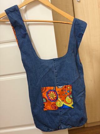 Bolso de tela con un diseño moderno y llamativo. - Estampado multicolor vibrante. - Diseño reversible tejano - Asa anudada para llevar al hombro o mano. Medidas 32 x 40