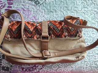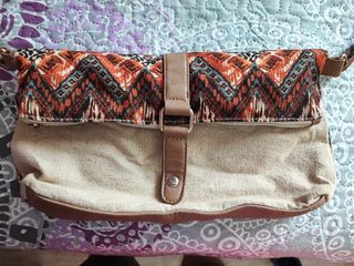 Bolso de tela con un diseño llamativo y detalles en piel. - Estampado étnico en la solapa. - Cierre con botón a presión. - Ribete inferior en piel sintética.