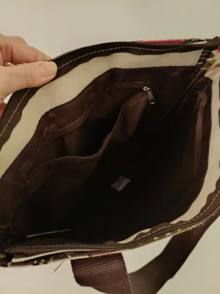 Bolso con estampado floral hawaiano; forro marrón oscuro. Aún conserva la etiqueta, me lo regalaron y no lo he estrenado (puede valer para regalo). Mide 36 cms. por 35 cms. aproximadamente. Tiene 2 asas marrones. 100% poliéster. Bolsillo interior. Las cremalleras funcionan perfectamente.
