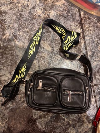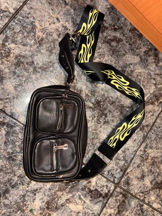 Bolso de la marca Bershka con un diseño moderno y llamativo. - Correa negra con estampado de llamas amarillas. - Dos bolsillos frontales con cremallera. - Material con textura.
