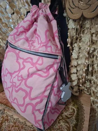 Mochila de la marca Tous con un diseño llamativo. - Color rosa con estampado. - Cierre de cremallera. - Incluye un charm. - Bolsillo exterior con cremallera.