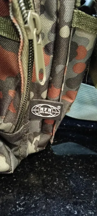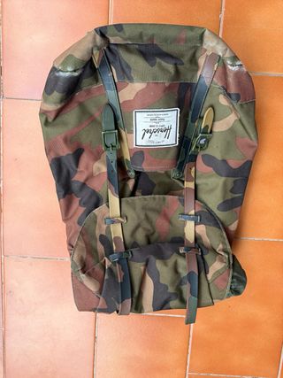 Mochila estilo militar con estampado de camuflaje. - Diseño clásico de Herschel. - Correas ajustables una de ellas esta rajada pero no afecta a su funcionamiento para nada - Bolsillo frontal con cierre.