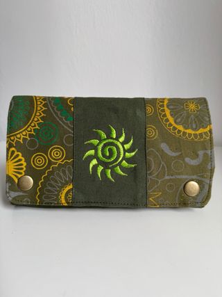 Cartera de mano de 100% algodón, hecha a mano en Nepal. Presenta un diseño vibrante con motivos circulares y un sol bordado en el centro. - Material: 100% algodón. - Origen: Hecho en Nepal. - Diseño: Estampado con motivos circulares y bordado de sol. -Tamaño 20x10,5x4cm