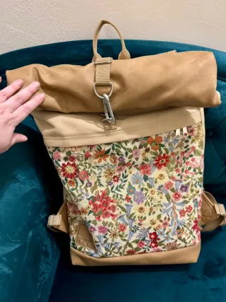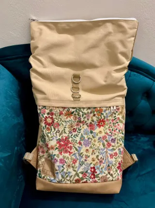 Mochila con un diseño único y llamativo, en tonos beige con estampado floral. Acceso superior con cremallera y cierre enrollable para mayor seguridad. Solo usada una vez. Excelente estado. EN: Like new beautiful tan and floral backpack. Top access (top zips and rolls down for security). Only used once. Excellent condition.