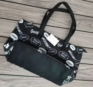 Práctica bolsa plegable con un diseño llamativo. - Estampado con motivos gráficos y texto. - Cierre con botón. - Asas para llevar cómodamente. Y práctica para llevar en el bolso.