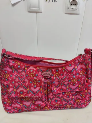 Bolso de la marca Oilily con un bonito estampado floral en tonos rosas y rojos. Cuenta con un asa larga para llevar al hombro y varios bolsillos. - Estampado floral. - Asa larga. - Múltiples bolsillos.