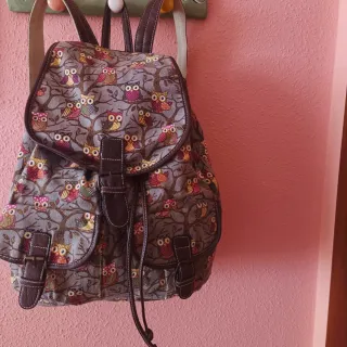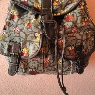 Mochila con un divertido estampado de búhos sobre fondo gris. Es nueva y tiene mucho espacio. El color de la segunda foto es el real. - Diseño con múltiples búhos coloridos. - Cierre principal con cordón y solapa. - Bolsillos frontales con cierre de hebilla.