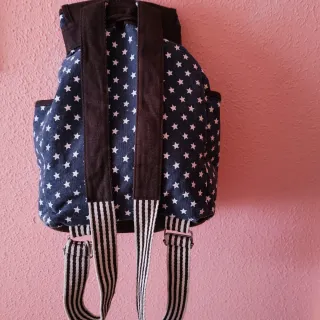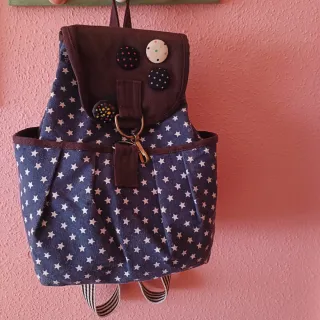 Muy comada, pesa poco y tiene mucha capacidad. Mochila vaquera con un bonito estampado de estrellas blancas sobre fondo azul. Los detalles y asas son de color marrón. - Cierre de solapa. - Bolsillos laterales. - Adornos decorativos. - Asas ajustables.