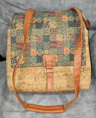 Mochila de mujer con un diseño llamativo y original. - Estampado étnico en tonos azules, verdes y coral. - Ribetes y asas en polipiel marrón. - Bolsillo frontal con cremallera.