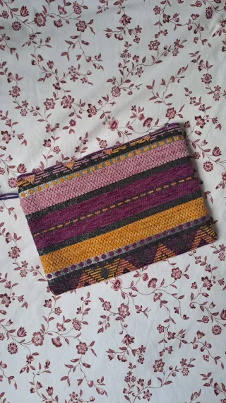 Neceser plano con un diseño estampado y vibrante. Perfecto para organizar tus esenciales. - Diseño de rayas multicolor. - Acabado con detalles brillantes. - Cierre de cremallera. - 26x18cm