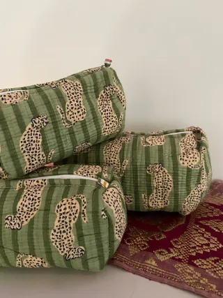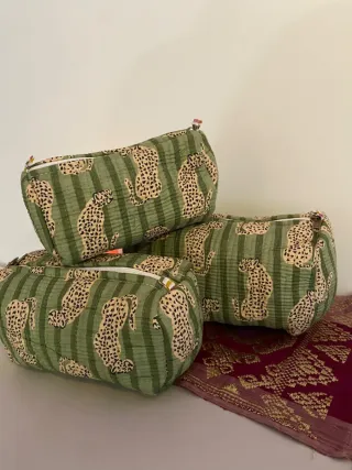Conjunto de tres neceseres acolchados con un bonito estampado. - Producto original de la India. - Diseño con rayas verdes y figuras de leopardos. El pack incluye tamaño pequeño, mediano y grande. Cada neceser es único: pequeñas variaciones de color o patrón son muestra de su carácter artesanal, no de defecto. Aprovecha las fechas y regala un producto consciente y sostenible de tejido y manufactura artesanal en Rajasthan, India. 🪷