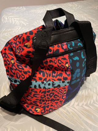 Mochila con un diseño vibrante y llamativo. - Estampado de leopardo y otros motivos. - Cierre de cordón. - Bolsillos frontales con cremallera. Mochila con estampado animal print de colores, muy original. Sin usar. Tiene un montón de compartimentos, incluido uno trasero para portátil o tablet. Muy cómoda de llevar Dimensiones: 37x 39 x 20 cm