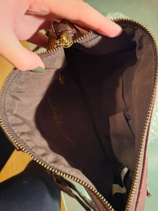 Conjunto de bolso de hombro y monedero a juego con un bonito estampado. - Bolso de hombro con correa ajustable. - Monedero redondo a juego. - Diseño estampado en tonos beige y marrón.