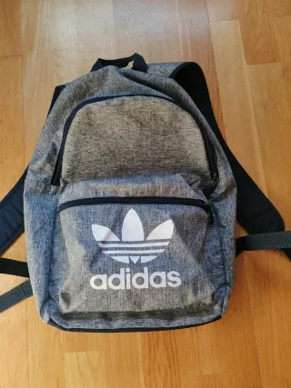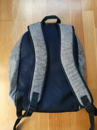 - Color principal gris con detalles en azul marino. Interior azul. - Estampado jaspeado. - Logo de Adidas en blanco en el bolsillo frontal. - Bolsillo exterior y otro interior. - Medidas: LARGO:44. ANCHO:29 FONDO:12