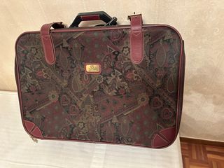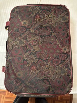Elegante maleta vintage con un llamativo estampado paisley en tonos marrones y burdeos. Perfecta para añadir un toque retro a tus viajes. - Diseño clásico con detalles en piel sintética. - Estampado paisley intrincado. - Asa superior para facilitar el transporte.