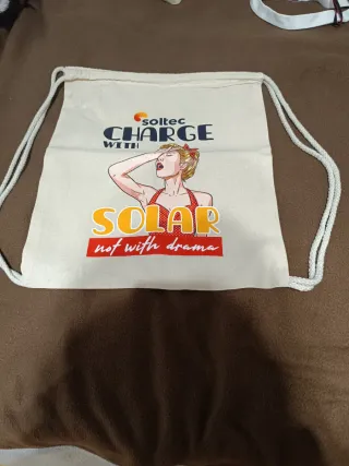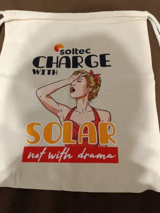Bolsa de cuerdas con un diseño vintage. - Estampado frontal con el logo de Soltec. - Ilustración de una mujer con el texto CHARGE WITH SOLAR not with drama. - Cierre de cordón. - Material de tela resistente. Mide 39 x 34 cm