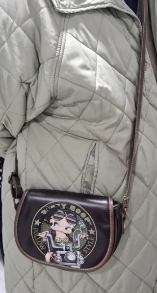 Bolso con diseño de Betty Boop. - Estampado frontal de Betty Boop en moto. - Ribete y correa en contraste. Medida 16,5 cm