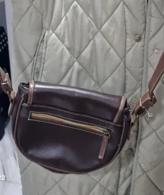 Precioso monedero pequeño, ideal para llevar lo esencial. Es de forma semicircular y tiene un cierre de cremallera. - Diseño estampado con dibujos en tonos beige y marrón. - Asa de cremallera marrón oscuro. - Perfecto estado.
