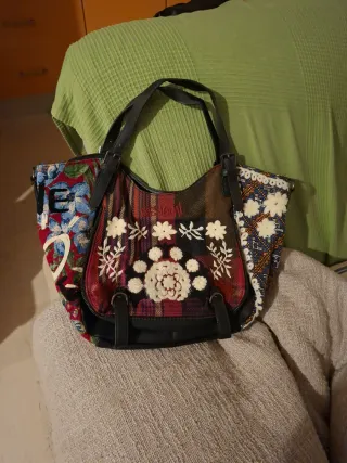 Original mochila y cartera de la marca Desigual con un diseño patchwork único. - Combinación de texturas y estampados florales. - Detalles en piel y efecto serpiente. - Cierre de cremallera. Poco uso.