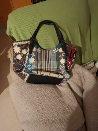Bolso de la marca Desigual con un diseño patchwork. - Combinación de tejidos con diferentes estampados. - Detalles en ante marrón. - Cierre de cremallera superior. - Bolsillo frontal con botones metálicos.