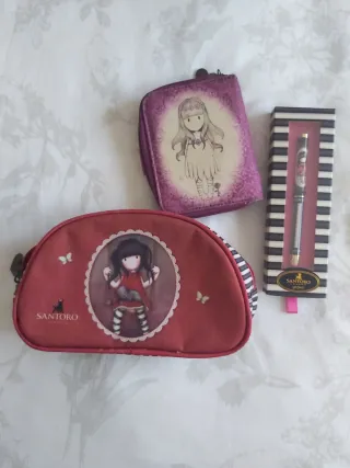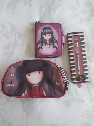 Conjunto de tres artículos de papelería y complementos de la marca Santoro. - Neceser con diseño de niña y mariposas. - Cartera a juego con estampado floral. - Bolígrafo con detalles decorativos. El neceser tiene bolsillos por dentro. Todo está nuevo a estrenar. También se puede vender por separado. Preguntar por privado.