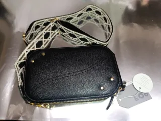 Bandolera negra con doble correa de hombro, una con estampado geométrico, y con otra pequeña para anclar en las hebillas de la parte trasera. Detalle de tachuelas doradas. Cuenta con dos habitáculos dobles para monedas y billetes y tarjetas, con cierre de cremallera dorada. Material: exterior poliuretano, forro interior de poliéster y metal para las fornituras. Medidas: 18 x 11 x 5 cms. Nueva.