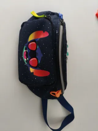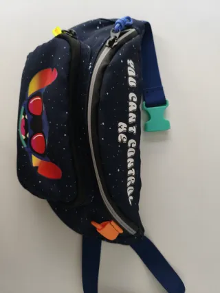 Riñonera de Zara Kids con diseño de Stitch. - Estampado de estrellas sobre fondo azul. - Detalle de Stitch con gafas de sol. - Cremallera principal y bolsillo frontal. - Tira ajustable.