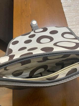 Bolso de mano con un llamativo estampado. - Diseño con lunares y remolinos. - Asa de mano. - Bolsillo frontal. Viene con una bolsa de tela tipo totebag de la misma marca. Sólo se ha usado una semana.