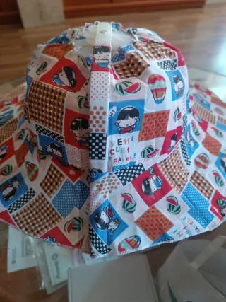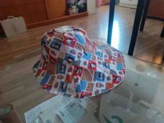 Sombrero plegable con un diseño alegre y llamativo. Plegado ocupa muy poco. Ideal para llevar en la mochila. - Estampado con cuadrados de diferentes dibujos. - Ala ancha para proteger del sol.