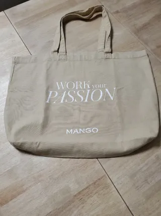 Práctica bolsa de tela con un diseño moderno y un mensaje inspirador. - Confeccionada en tela resistente. - Color beige neutro. - Estampado WORK your PASSION en blanco en las dos caras. - Logo de Mango visible.