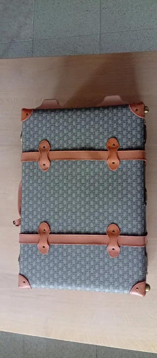 Maleta de la marca Salvador Bachiller con un diseño estampado. - Color gris y marrón. - Asa de mano. - Cierres metálicos. - Detalle de correas de cuero.
