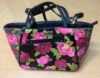 Bolso de mano con un llamativo estampado floral de rosas sobre fondo negro. Los laterales presentan un diseño texturizado. - Cierre de cremallera principal. - Bolsillo exterior con cremallera. - Adorno de cremallera con charm. - Asas superiores negra - 33x23 cm