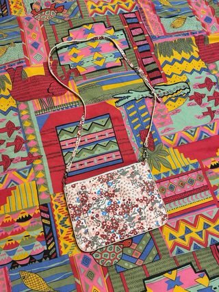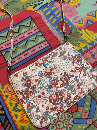 Bolso de mujer con un diseño estampado y correas de cuero. Evidentes signos de uso en las esquinas pero por dentro está como nuevo. - Diseño geométrico y floral. - Cierre de cremallera. - Correa ajustable.