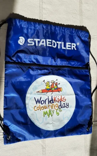 Mochila infantil de la marca Staedtler, perfecta para las actividades. - Diseño con estampado de World Kids Colouring Day y un lápiz. - Cierre de cremallera en la parte superior. - Cordones para colgar y cerrar la mochila.