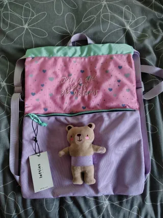 Mochila tipo saco para niña, con un diseño divertido y juvenil. Perfecta para llevar lo esencial. - Estampado de corazones en tonos rosas y azules. - Detalle bordado JUST A GIRL WITH BIG DREAMS. - Incluye un peluche de osito. - Cierre de cordón y cremallera. - Etiqueta original.