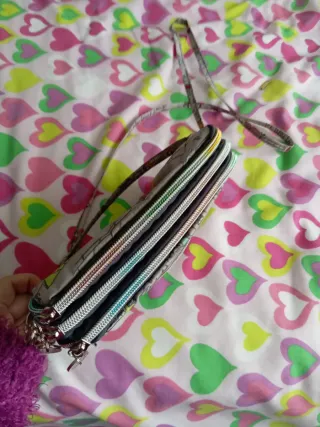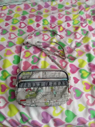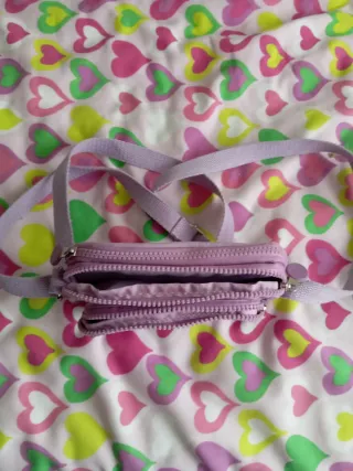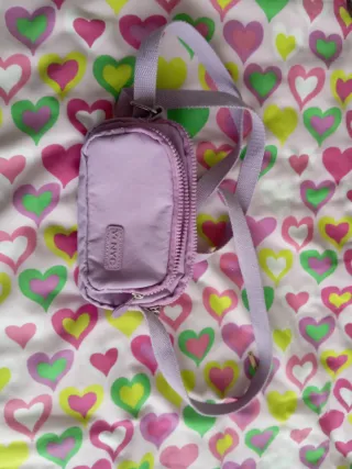 Bolso pequeño con un diseño divertido y juvenil. - Color morado y multicolor. - Estampado de corazones. - Correa ajustable.