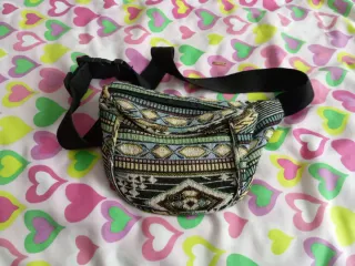 Riñonera con un diseño étnico y vibrante. Perfecta para llevar tus esenciales. - Tejido con estampado geométrico. - Correa ajustable con cierre de clip. - Compartimento principal con cremallera.