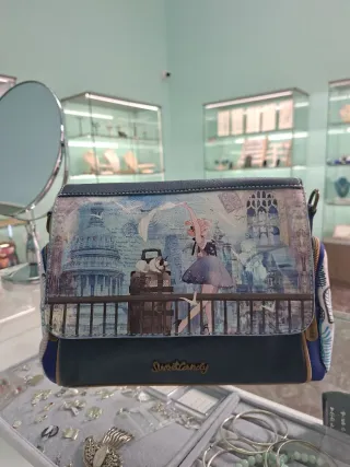 Bolso de la marca Sweet Candy con un diseño artístico. - Estampado multicolor con detalles de edificios y una bailarina. - Asa y detalles en color azul marino.