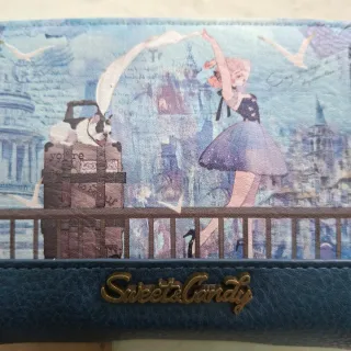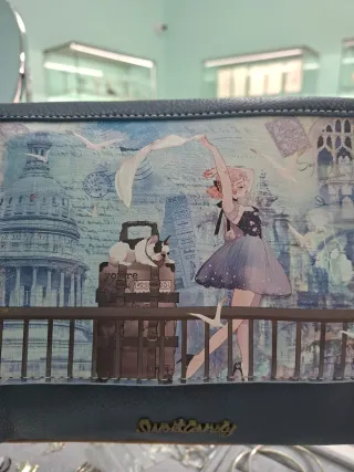Cartera con un diseño artístico y detallado. Presenta una escena con una bailarina y elementos arquitectónicos. - Estampado con temática de ciudad y aves. - Detalle de etiqueta sweet candy en el lateral.