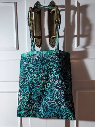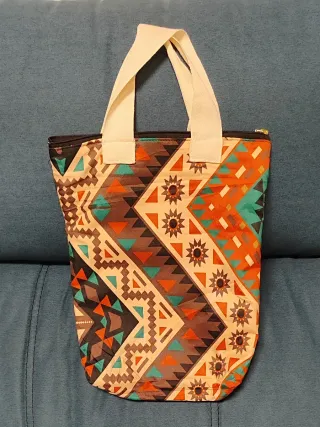 Bolso de tela con un llamativo estampado. - Diseño único y colorido. - Asas resistentes para llevar cómodamente.