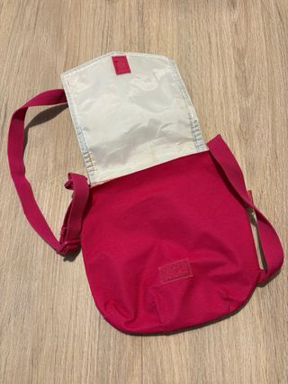 Bolso de la marca Desigual con un diseño único. - Combinación de colores rosa y morado. - Cierre de cremallera.
