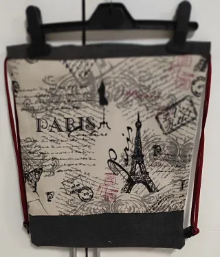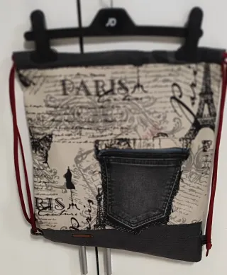 Mochila de cuerdas hecha a mano con un diseño inspirado en París. - Estampado con motivos parisinos y texto. - Detalle de bolsillo de tela vaquera. - Cierre de cordón. -Interior forrado