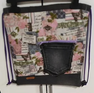 Mochila de cuerdas hecha a mano con un diseño único. - Estampado floral y de letras. - Bolsillo exterior de tela vaquera. - Cierre de cordón. - Detalle de etiqueta de cuero. -Interior forrado