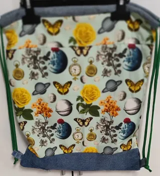 Mochila de cuerdas hecha a mano con un diseño único y llamativo. - Estampado con motivos de mariposas, rosas amarillas, relojes y planetas. - Bolsillo frontal con cremallera. - Detalle de bolsillo de pantalón vaquero en la parte delantera. - Base y tirantes de tela vaquera. -Interior forrado y con bolsillo