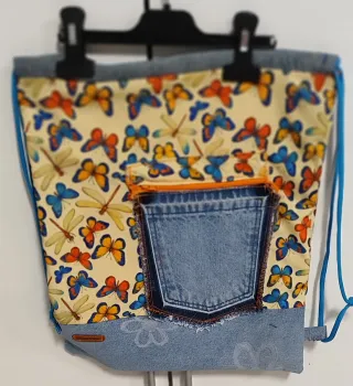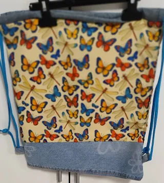 Mochila de cuerdas hecha a mano con un alegre estampado de mariposas y libélulas. - Diseño único y colorido. - Bolsillo exterior de mezclilla. - Cierre de cremallera naranja. -Interior forrado y con bolsillo