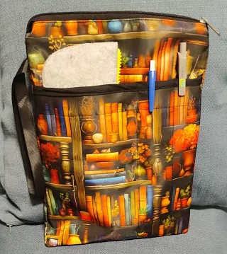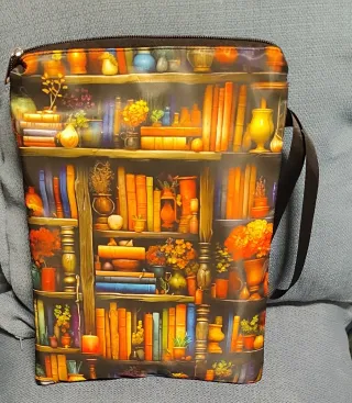 Funda para libro con un diseño de estantería lleno de libros y objetos decorativos. - Diseño detallado de estantería. - Estampado multicolor con tonos naranjas - Dos compartimentos para guardar bolígrafos y otro más grande.